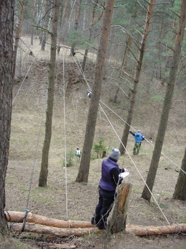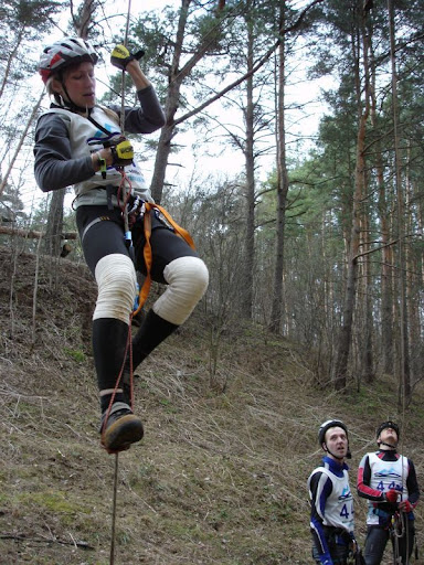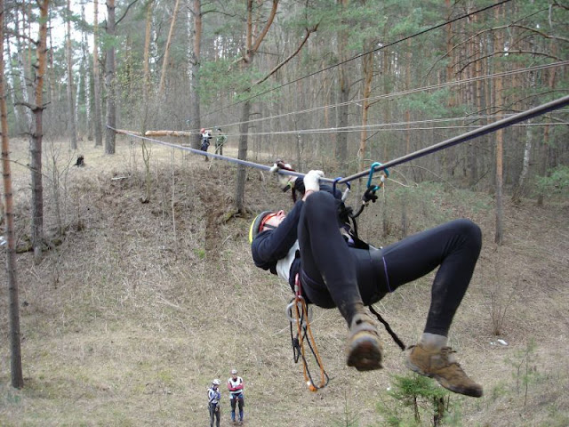 Через овраг натянута навеска длиной метров 30, посреди которой вбит карабин с веревкой, уходящей вниз. Один член команды проходит навеску с перестежкой посредине, а два других жумарят вверх со дна оврага и уходят, перестегиваясь на навеску. Решаем что Сергей проходит навеску, а мы с Наташей будем жумарить. Но самое веселое, что на техэтап установлено контрольное время на команду – 8 мин. Потихоньку становится понятно, почему так смотрели на схваты на проверке снаряжения. Все же связка пантин-жумар в опытных руках куда быстрее.