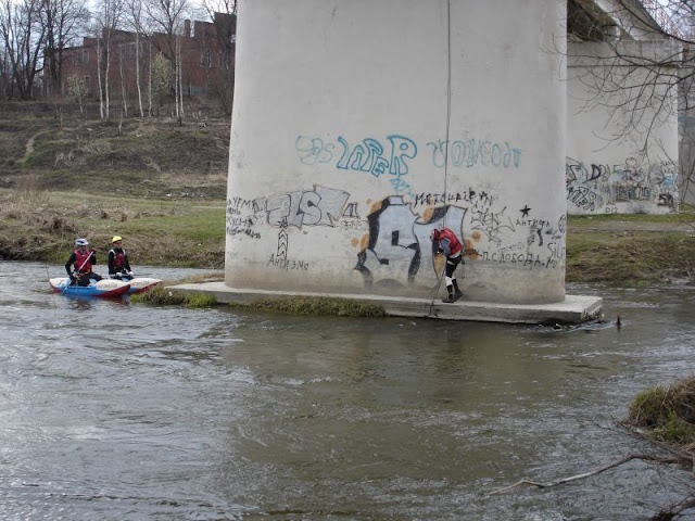 Между быком стоящим на берегу и быком, стоящим по центру реки натянута связка: жумар – навесная – дюльфер. Команда грузится на кат выше моста, сплавляется ниже по течению высаживает участника, работающего на веревках и траверсируют к быку посреди реки, где и ожидают участника.