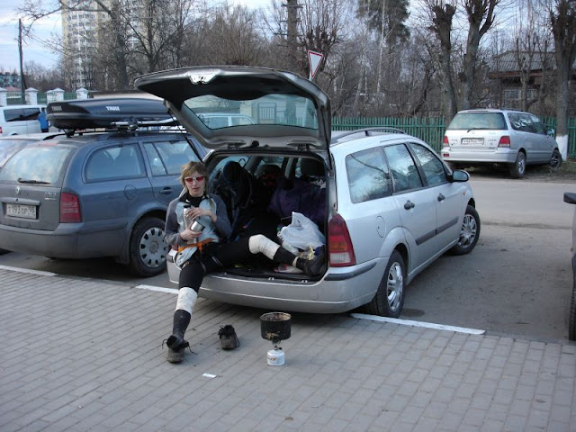 Перекусываем на скорую руку, раскидывая шмотки прямо вокруг машины. Прикольно наблюдать сборы прямо посреди тротуара, среди прохожих чуть ли не в центре городка.