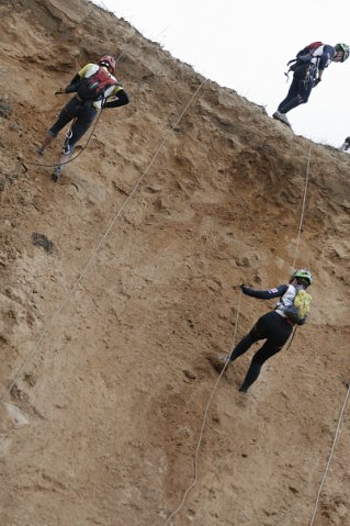 Транзитка в большом песчаном карьере. Быстро переобуваемся, впрыгиваем в системы и уходим на этап. Тех этап представляет собой подьем с помощью жумара по круто провешенным перилам. Один за одним, поднимаемся наверх и уходим на этап GPS-ориентрования.